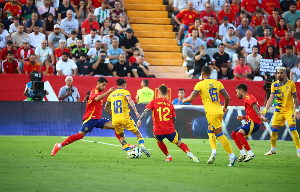 Ha estat Ayoze el primer a aprofitar la feblesa tricolor dins l’àrea després d’un córner on, gràcies a una prolongació de Cubarsí, el davanter del Betis ha controlat l’esfèrica amb el pit per girar-se i enganxar un xut imparable per Iker Álvarez al 25’. El gol ha provocat que Andorra s’estirés en petita mesura i ‘Cucu’ ha pogut posar a prova per primera vegada a Raya sota pals. A la següent jugada era Morata que aprofitava una passada filtrada de Pedri per marcar el segon, però el col·legiat ha assenyalat fora de joc del davanter madrileny.