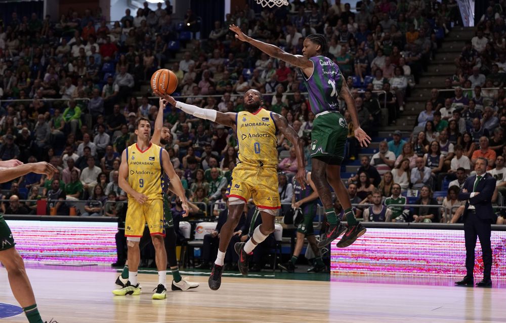 Quatre pèrdues en menys de quatre minuts a l’inici de la segona meitat han posat les coses molt complicades per poder optar a la remuntada. Tot i això, entre Evans i Harding han començat a sumar punts per compensar la diferència i col·locar-se a tretze (57-44). Llavors han tornat a aparèixer Perry i Tillie anotant de tres, mentre Ejim es penjava pel +21. Només a la fi del tercer quart, amb el conjunt malagueny que ja portava estona en bonus, l’Andorra ha apujat la defensa per establir un parcial de 0-10 gràcies a la labor del francès Goudou-Sinha, que ha tornat a comptar amb uns minuts molt profitosos (6 punts).