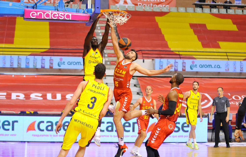 El primer quart del MoraBanc ha estat perfecte. La connexió Dime-Paulí ha fet estralls, i el domini en els rebots han tancat un parcial de 15-25. Els murcians han apretat moltíssim en defensa forçant en algun atac als tricolors a esgotar la possessió sense llençar a cistella. Hannah, un jugador habitualment segur, perdia tres pilotes i els triples locals han capgirat el marcador amb un parcial de 28-9.(43-34). A la represa tres triples consecutius del MoraBanc (dos de Senglin i un de Jelinek) amb un parcial de 4-12 han tornat a equilibrar el partit. La reacció dels homes d'Ibon Navarro no ha estat determinant entre altres coses per les errades en els tirs lliures. Ha estat un quart amb imprecisions i nervis.