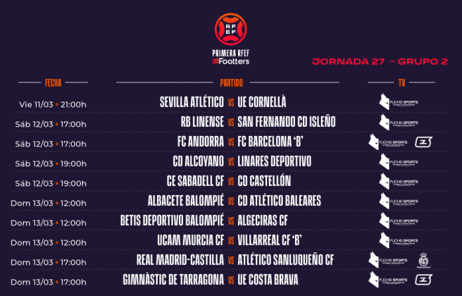 Entre setmana, l’Albacete va sumar els tres punts al camp del Madrid Castilla i es va situar primer. L’empat del Vila-real al camp del Costa Brava el va col·locar en segon lloc. Cal recordar, però, que l’Andorra té un partit pendent, el que jugarà al camp del Linares dimecres vinent. Per tant, els tricolors mantenen vives totes les opcions. Això sí, per aprofitar-les cal no fallar contra el Barcelona B.