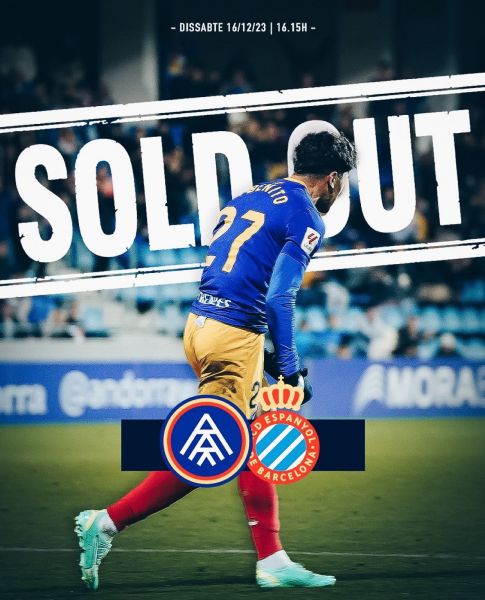 El club ha penjat el cartell de ‘No hi ha entrades’ i tot l’aforament de l’Estadi Nacional (més de 3.300 seients) està venut. La visita de l’Espanyol ha aixecat molta expectació entre els aficionats de l’Andorra que no es volen perdre un dels millors partits de l’any contra un rival que vol tornar a la màxima categoria del futbol espanyol. Precisament, servirà per tancar el 2023 a casa amb l’objectiu de sumar una nova victòria i oferir un bon regal a l’afició.