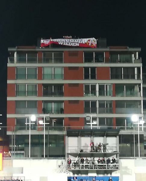 Alguns, però, no han renunciat al desig de veure el partit. Conscient que dins del camp no hi entrarien, han buscat finestres o balcons d’edificis propers, oferint, fins i tot, diners als propietaris dels pisos per poder entrar. Alguns ho han aconseguit, com demostra la pancarta que s’ha col·locat en un dels blocs de davant l’Estadi Nacional.