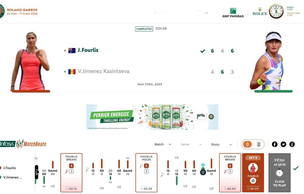 En el primer set, hi ha hagut igualtat durant una bona estona. El duel ha començat amb un trencament de servei per banda i això ha fet que s’arribés al 4-4. Jiménez, però, ha perdut el novè joc i, a diferència dels moments inicials, no ha pogut corregir. L’australiana s’ha endut el primer parcial per 6-4.