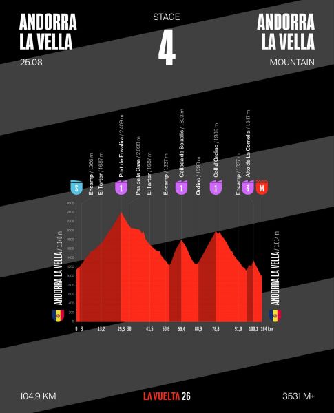 Des d’allà, l’expedició es desplaçarà cap a Andorra la Vella, L’etapa ‘tricolor’, el 25 d’agost, sortirà i arribarà a la capital. Serà “curta però dura”, s’assegura des de l’organització. Així, en total, tot just 104,9 quilòmetres, però de gran exigència. La primera etapa de muntanya de l’edició.