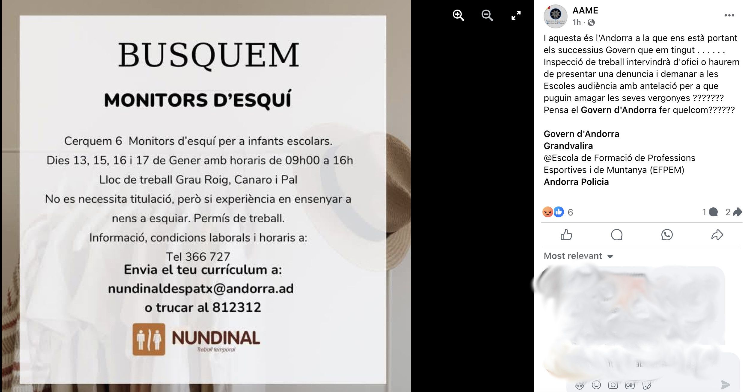 L’anunci explica que es busquen 6 monitors d’esquí a per a infants escolars per als dies 13, 15, 16 i 17 de gener amb horaris de 9 a 16 hores a Grau Roig, Canaro i Pal. Ara bé, l’element controvertit arriba quan l’oferta assegura que “no es necessita titulació, però sí experiència en ensenyar a nens a esquiar”. Sí que es demana, en canvi, permís de treball.
