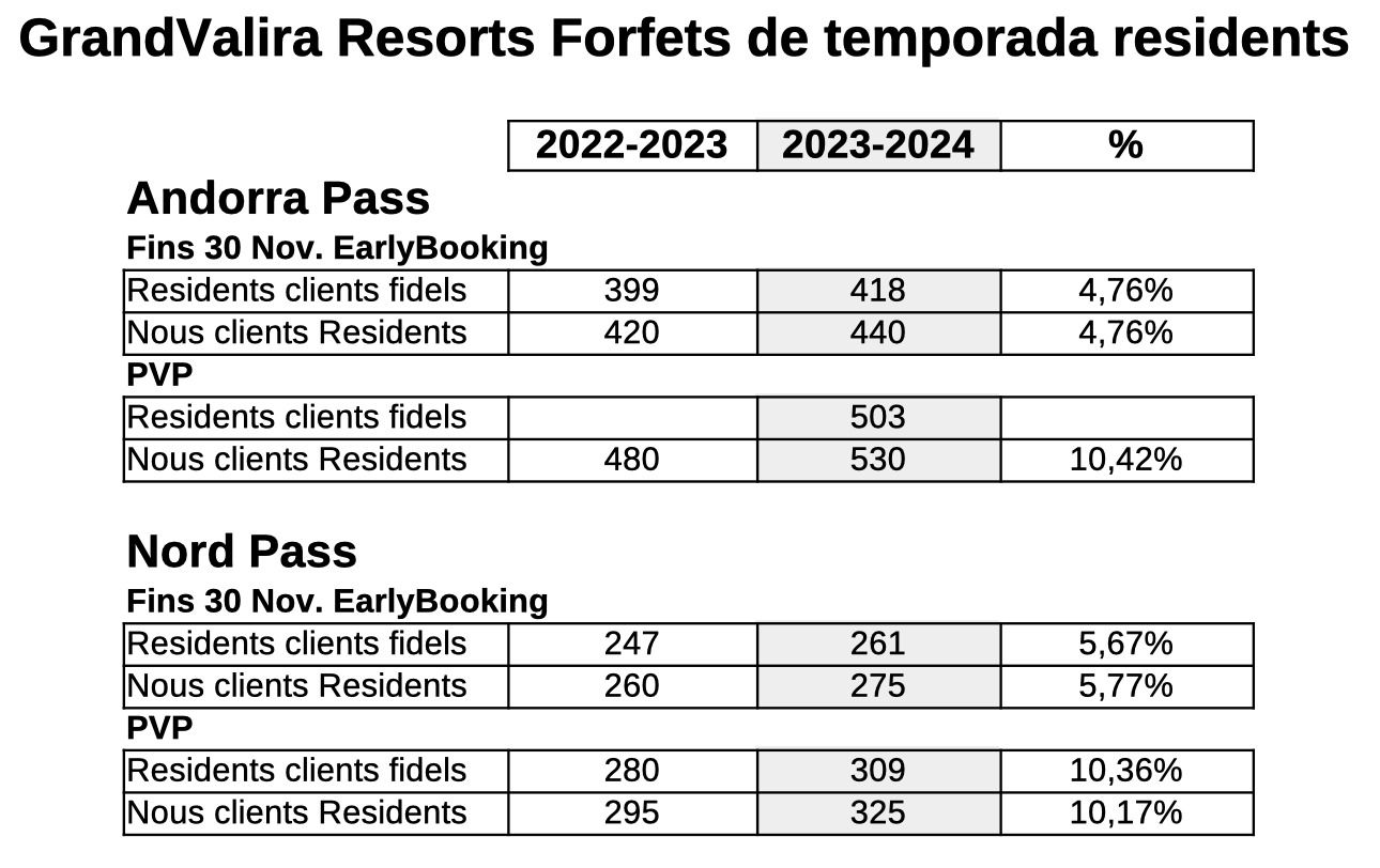 Per la seva banda, els clients fidels residents que adquireixin el Nord Pass, podran fer-ho per 261 euros durant el període promocional (247 euros la temporada passada) i per 309 euros a partir de l’1 de desembre (280 euros un any enrere). Els nous clients podran adquirir el Nord Pass per 275 euros fins al 30 de novembre (260 la temporada passada), mentre que el preu passarà a ser de 325 euros en el període PVP (295 euros ara fa un any).