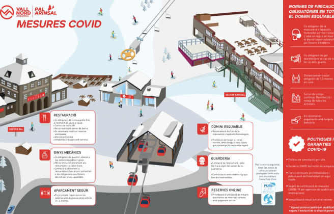Per a més informació respecte a les mesures que s’han establert en les diferents instal·lacions de l’estació, podeu consultar aquest enllaç. Així mateix, a més d’aquests protocols, l’estació ha establert unes mesures com a ‘garanties Covid-19’ per als forfets de temporada i per les compres de paquets turístics, les quals es poden conèixer mitjançant aquest link.