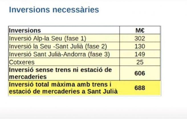 El projecte preveu una línia entre Alp i la Seu i, en una segona i tercera fase, pujar fins a Sant Julià i, posteriorment, Andorra la Vella i Escaldes, en aquest cas ja de forma soterrània. En total, uns 606 milions d’euros, amb la possibilitat que a la parròquia laurediana es construeixi també una terminal per a mercaderies. Això elevaria la inversió a 688, segons els càlculs de Noy.