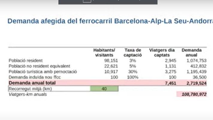Pel que fa al nombre de viatgers, s’ha mostrat convençut que aquesta via ferroviària tindria una elevada demanda. Segons els seus càlculs, de fins a 7.451 usuaris per dia, entre residents a les diferents zones i turistes. “El gruix de la demanda per Alt Urgell i Andorra vindria de Barcelona”, ha afirmat. Per cobrir aquesta xifra, ha apuntat, caldrien 37 trens diaris per sentit, tot i que ha apostat per un inici més prudent, amb una quinzena.