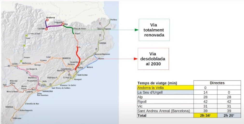 L’enginyer també ha assegurat que un dels grans avantatges seria reduir el temps de trajecte entre Andorra i Barcelona. Segons ha assegurat, a partir del 2030, amb el desdoblament de la línia Vic-Montcada, el temps de trajecte podria ser tot just de dues hores i 34 minuts. També caldria, ha admès, invertir a crear més punts d’encreuament entre Alp i Ripoll.