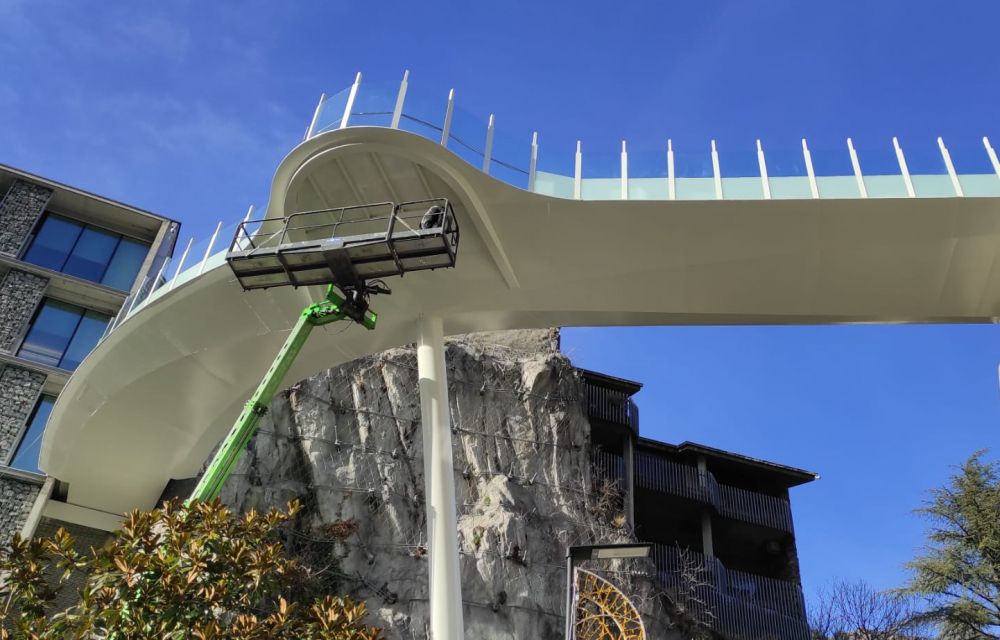 Així doncs, a l’espera del subministrament del vidre, s’ha instal·lat un paviment metàl·lic provisional per tal de permetre l’accessibilitat en aquest punt. Quan els vidres siguin subministrats aquests reemplaçaran el paviment metàl·lic, de tal manera que partir de llavors el terra del mirador serà transparent. La fabricació d’aquests vidres s’ha endarrerit a causa de la pandèmia, segons el Govern, que per ara no preveu una inauguració oficial del vial, justament, per culpa de la crisi sanitària.