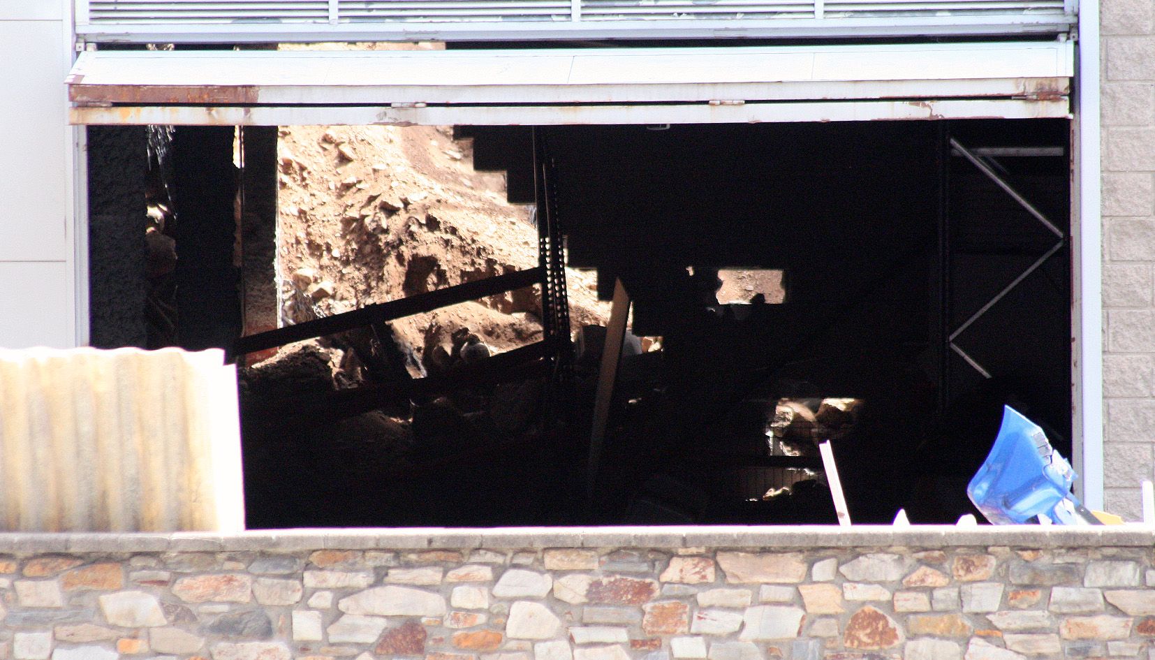 El més conflictiu és el terreny que queda just damunt del magatzem comunal, derruït en gran part per la part posterior, i que conscients tots els tècnics que s’ha de desprendre en qualsevol moment no se’n sap el comportament exacte que pot tenir ni menys encara la repercussió. L’edifici comunal ja es dóna per perdut i en gran mesura s’ha tret tota la maquinària i material que hi havia a l’interior.