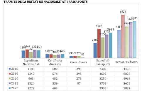 En conjunt, aquest darrer any citat és el que el departament de Justícia i Interior més documentació va tramitar, un miler més que aquest passat 2022. És a dir, 6.828 per 5.824. Això sí, aquest 2022, en general, s’han fet més certificats genèrics que no pas el 2019 (609 per 576). El darrer any finalitzat, en canvi, destaca per ser un dels exercicis darrers en què menys expedients de nacionalitat s’han tramitat. És clar, però, que al 2020, amb l’esclat de la pandèmia, tot va caure, tot va ser inferior.