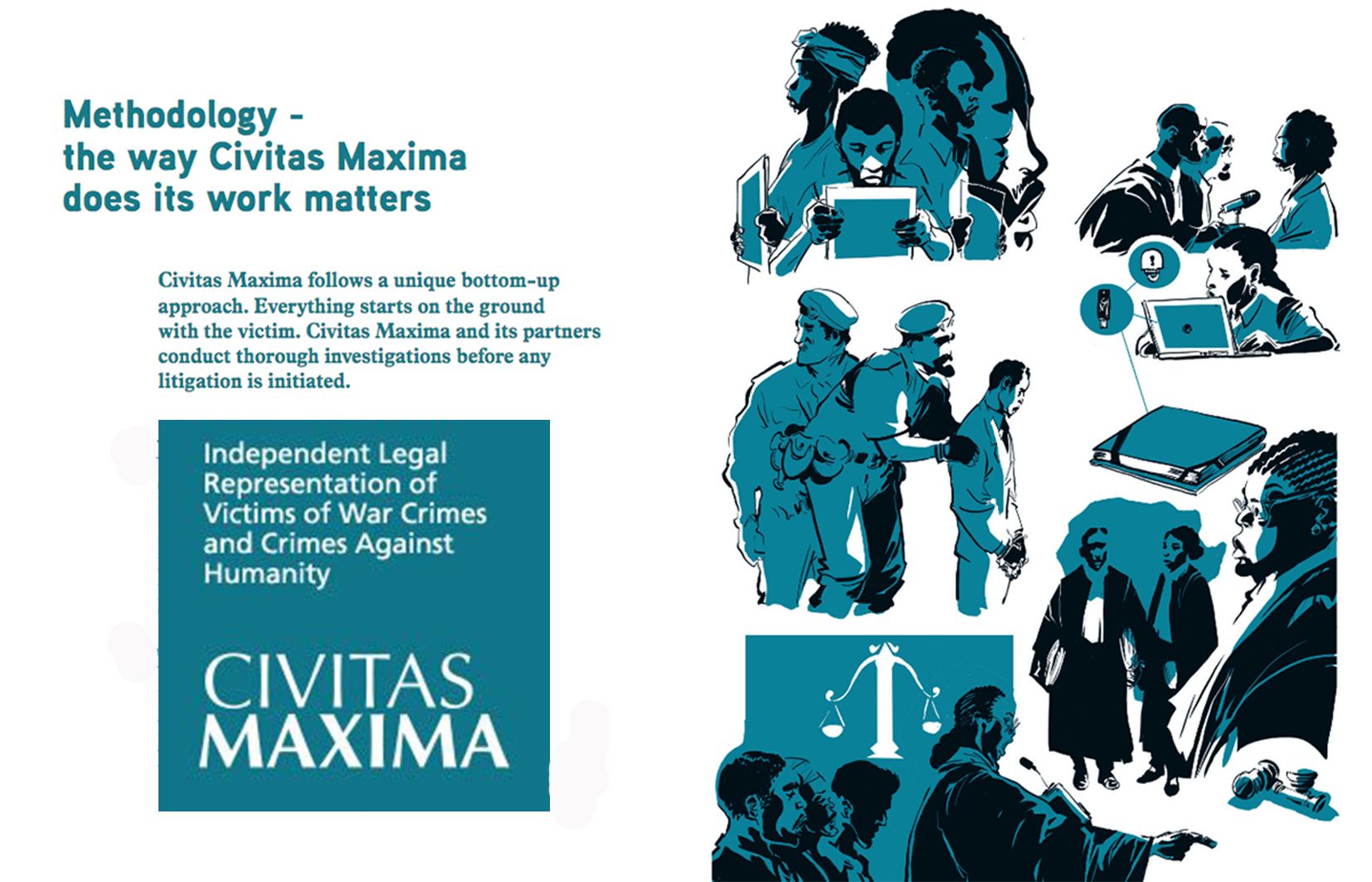 Civitas Maxima s’encarrega d’obtenir documentació i informació sobre crims i processar-la jurídicament. A partir d’aquí posa en marxa una extensa xarxa de col·laboradors per tal de mirar de resoldre els casos, de denunciar-los i de fer pedagogia sobre allò que no ha de poder tornar a passar mai. L’ONG suïssa coopera amb una entitat africana. El mètode de treball és furgar sempre sobre el terreny. Sobre on han passat els crims. I exemplificar el comportament delictiu d’una empresa, d’un conjunt de persones o del que sigui a partir del cas d’una persona que hagi estat víctima del crim.