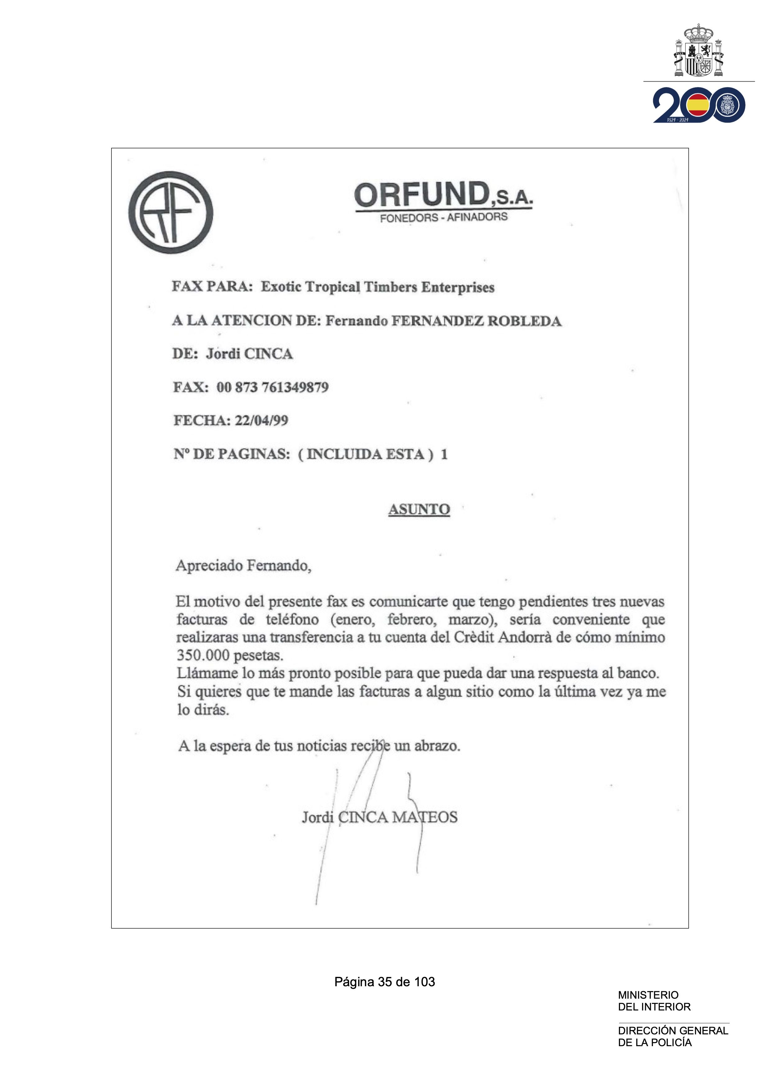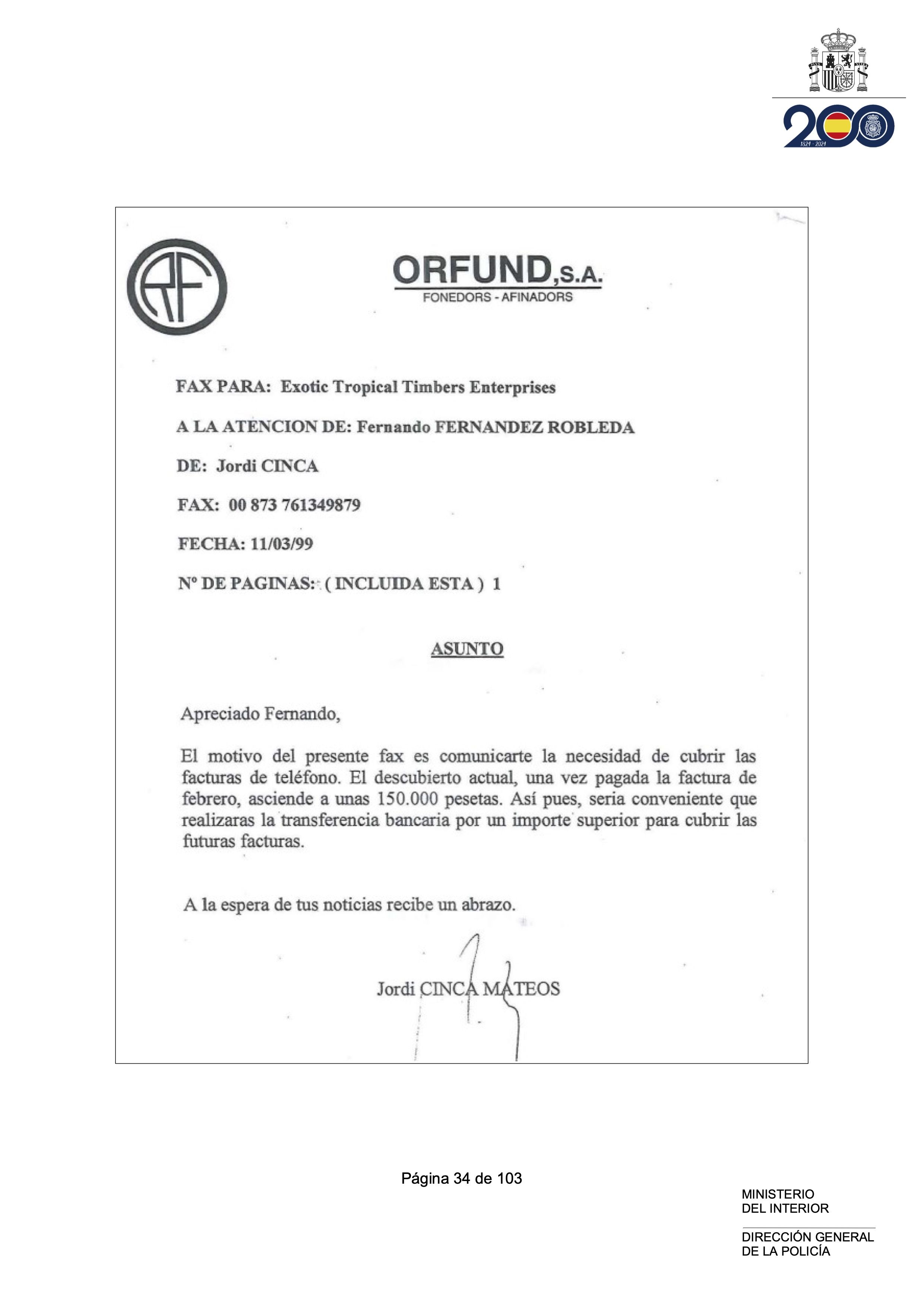 “Reprenent el grau de coneixement de l’esdevingut per part de Jordi Cinca a Libèria, així com els vincles que Manuel Terrén havia establert sobre el terreny entre totes les persones citades, aquest coneixement arriba al fet que que fins i tot el telèfon del mateix Fernando Fernández Robleda (director d’Exotic Tropical Rimbers Exnterprises) era pagat per Orfund, amb coneixement i anuència de Jordi Cinca tal com es reflecteix en diverses comunicacions on li reclama el pagament del mateix”, diu en un passatge l’informe de la policia espanyola.
