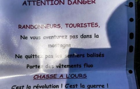 La zona fronterera de l'Arieja amb Andorra viu amb passió la reintroducció de l'os amb col·lectius a favor i en contra. Les accions d'uns i altres són constants amb manifestacions, pintades a la carretera o cartells. Un d'ells avisa els senderistes del risc de sortir dels camins senyalitzats, recomana que vagin amb roba llampant i adverteix que poden rebre una bala perduda destinada a un os. "Els projectils poden ser mortals a més de tres quiòmetres", es recorda en el cartell.