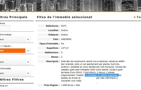 El pis de la polèmica és un sota àtic nou a estrenar en un edifici de construcció recent ben orientat, lluminós i assolellat, a una zona residencial molt tranquil·la de la parròquia ordinenca. El preu que es demana és de 1.600 euros al mes, incloent-hi dues places d’aparcament i traster. La indignació, però, s’ha aixecat pel fet que, ara fa unes hores, en l’anunci s’especificava clarament que el propietari “no admet ni infants ni mascotes”.