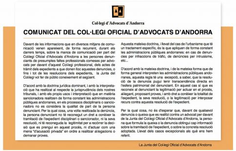 L’ens presidit per la degana Sophie Bellocq emetia el comunicat “davant de les informacions que en diversos mitjans de comunicació venen apareixent, de forma recurrent, durant els darrers temps, sobre la manca de comunicació per part del Col·legi Oficial d’Advocats d’Andorra a les persones denunciants de presumptes faltes professionals comeses per advocats per davant d’aquest Col·legi professional, dels actes de tràmit dels expedient a que donen lloc aquestes denúncies o, fins i tot, de les resolucions dels expedients”. El comunicat, per tant, sembla que vingui a dir als treballadors de BPA que són uns pesats per insistir i que ja feia molt temps que la situació estava clara.