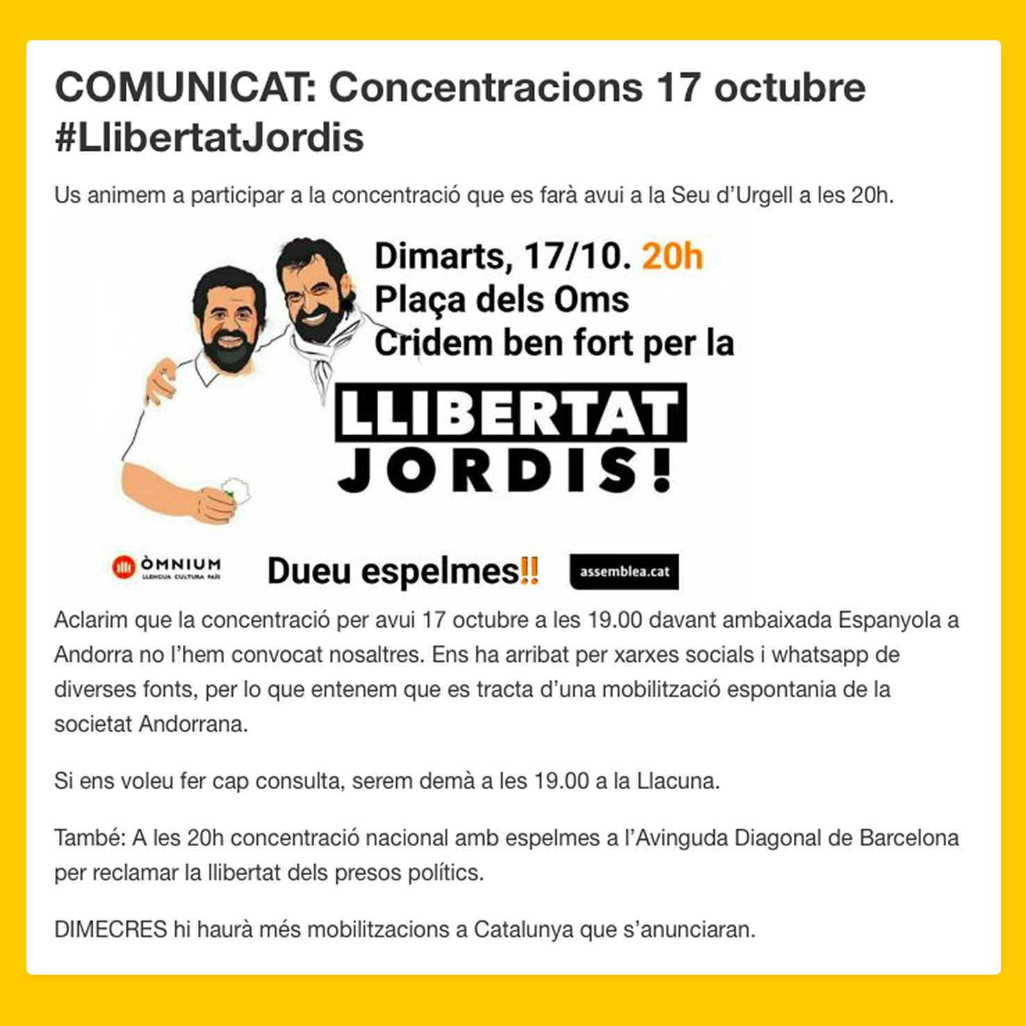 - De forma espontània entre la ciutadania, s’ha convocat per aquesta tarda a les 7, a l’ambaixada d’Espanya a Andorra, un acte pacífic per demanar la llibertat dels presidents d’Òmnium i ANC