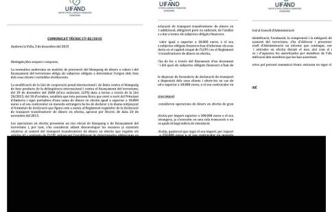 Com ja va avançar l’Altaveu, el 3 de desembre la UIF va enviar una norma d’obligat compliment per a les entitats financeres sota la fórmula de comunicat tècnic, en què es recullen noves mesures per controlar el diner en efectiu. Tant els ingressos com els reintegraments. Tot deriva, o així ho justifica la UIF, de la modificació de la Llei de cooperació penal internacional i de lluita contra el blanqueig que estableix que “tota persona física que entri o surti del Principat d’Andorra i sigui portadora d’una suma de diners en efectiu igual o superior a 10.000 euros o el seu contravalor en moneda estrangera ho ha de declarar a la duana mitjançant un formulari de declaració”. Aquesta és la base del control que ara es demana als bancs i entitats financeres que imposin als seus clients.