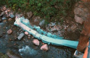 Una bona estona després de la injecció ha començat a baixar formigó barrejat amb aigua pel riu, encara que Medi Ambient ho nega. De fet, la inspecció del departament que dirigeix Marc Rossell i encapçala Sílvia Calvó no s’ha iniciat formalment fins a les 16.30 hores, molt després que s’hagués injectat i també després que hi hagués hagut tot l’enrenou i els operaris que treballen en l’obra ja haguessin fet mans i mànigues per retirar allò més gros que hagués pogut quedar al riu. De fet, la inspecció de Medi Ambient és fins i tot posterior a la informació avançada per l’