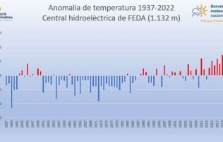A l'estació meteorològica de la central hidroelèctrica de FEDA, entre Escaldes i Encamp, s’ha registrat una temperatura mitjana anual de 12,4ºC quan la normal climàtica (període de referència 1980-2010) se situa a 10,1ºC. És a dir, la temperatura del 2022 ha estat 2,3ºC superior a l’habitual, que no és poc ni molt menys. De fet, és el més elevat en la seqüència iniciada el 1937.