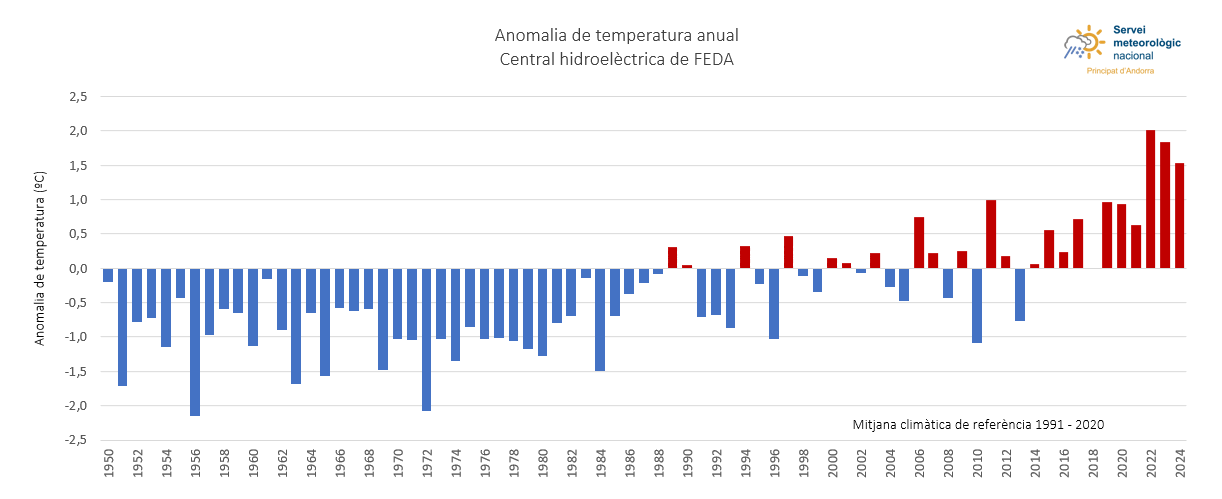 Acció Climàtica destaca en el resum que el 2024, juntament amb el 2022 (en la primera posició) i el 2023 (en segona posició), han estat els tres anys més càlids dels últims 74. De fet, s’han donat tres anys consecutius en què la temperatura mitjana ha superat els 12ºC i les anomalies han estat per sobre del 1,5ºC. L’increment de la temperatura des de principis dels anys 2000 es fa evident també perquè des del 1950 els deu anys més càlids s’han produït els darrers 20 anys.