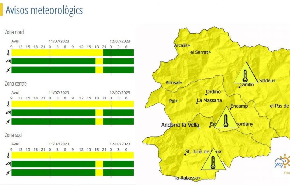 El Servei Meteorològic d’Andorra preveu una temperatura màxima a la capital del país de 34 graus, mentre que a 1.500 metres s’arribarà als 30. Les mínimes no arribaran als 20 graus a Andorra la Vella i es quedaran als 18 graus.