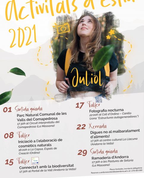 La programació continuarà el 17 de juliol amb el fotògraf Esteve Argelich, que impartirà un taller de fotografia nocturna. El 22 de juliol es proposa una xerrada sota el títol ‘Digues no al malbaratament alimentari!’, que tindrà lloc al centre cultural La Llacuna d’Andorra la Vella. Per últim la darrera activitat serà el 29 de juliol a les 17:30 h i consistirà en una sortida guiada per descobrir la ramaderia. Concretament, es desplaçarà fins a les pastures de Setúria, a la Massana.