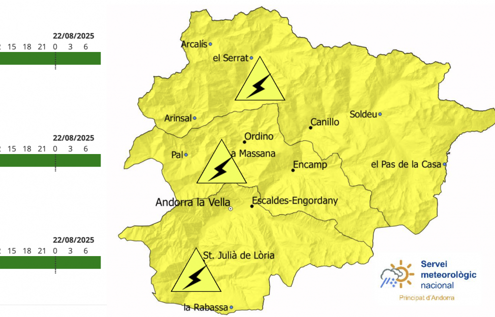 El Servei Meteorològic Nacional ha activat l’avís groc a tot el territori andorrà per la caiguda de tempestes localment intenses aquesta tarda. A través de les xarxes socials, el servei informa que “la inestabilitat provocada per l’embossament d’aire fred del sud de França” es manté. I aquesta tarda, “els núvols tornaran a ser més importants”; per tant, tornaran a caure, previsiblement, fortes pluges al conjunt del país. L’avís groc s’ha establert fins a les nou del vespre.