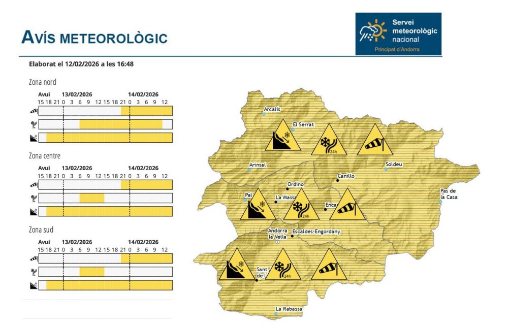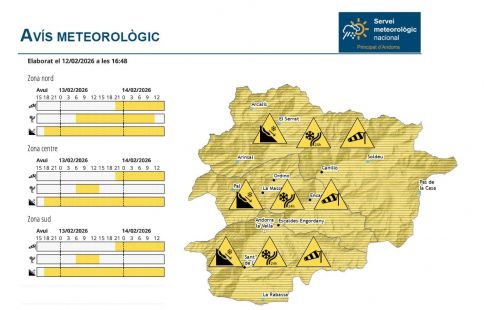 Segons la previsió del Servei Meteorològic, hi haurà febles nevades al matí que poden afectar tot el país, però la tendència serà a pujar de cota, fins als 1.500 metres al migdia, quan es preveu que s’obrin clarianes. De fet, l’avís groc a la zona centre i sud es limita de les 6 a les 15 hores, mentre que al nord es manté fins al migdia de dissabte. A la nit es preveu que la cota de neu torni a baixar.