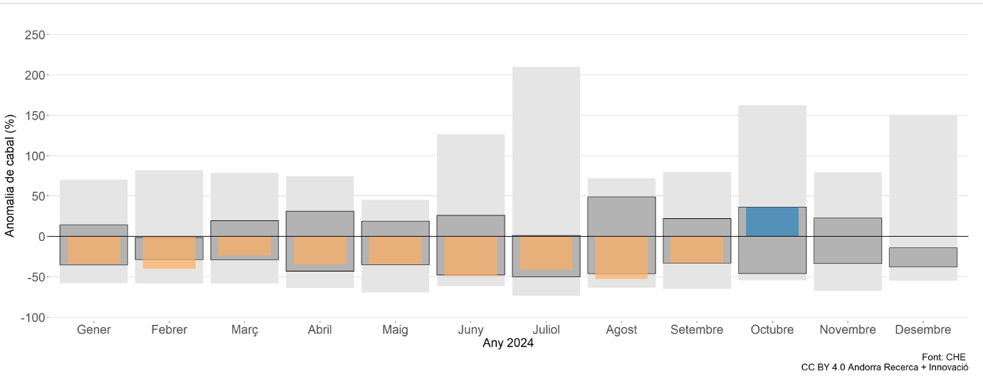La continuïtat en la pluja que ha caigut s’ha pogut començar a veure en el cabal dels rius. L’Investigador d’Andorra Recerca + Innovació, Oriol Travesset, explica que “veníem d’una situació important de sequera i això havia provocat que el terreny estigués molt sec”. Per tant, l’aigua que havia caigut en els mesos anteriors ha permès que a poc a poc els boscos s’hagin pogut recuperar i els aqüífers també. Això explica el fet que aquest octubre s’hagi vist una anomalia positiva que es troba al voltant del 35% per sobre del període de referència. De fet, feia gairebé dos anys que no es veia aquest, podríem dir, brot verd.