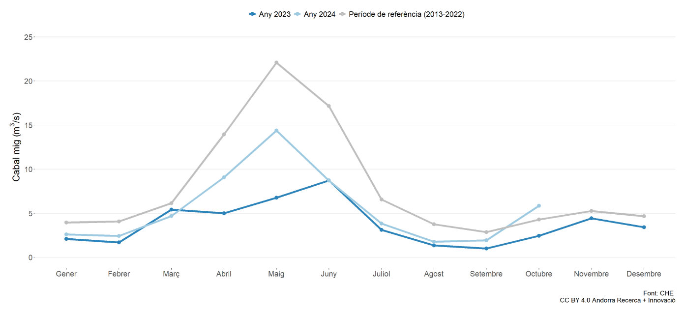 El 2023 va ser un any especialment sec, però remarca que també hi va haver una certa recuperació, però “no tan accentuada com aquesta”. De fet, el principal pic en els rius pirinencs s’observa a la primavera coincidint amb la fosa de neu. A la tardor, també n’hi ha un altre, però de molta menys magnitud.