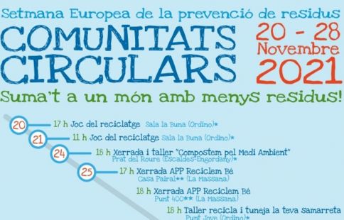 Del 22 al 26 de novembre, entre les 9 hores i les 13 hores, la ciutadania també podrà recollir a la seu d’Andorra Sostenible contenidors d'envasos i paper i cartró per fer més fàcil i còmode la recollida selectiva. De manera paral·lela a aquestes activitats, els comuns també han impulsat un seguit d’iniciatives entre les quals s’hi inclouen una xerrada-taller sobre compostatge que tindrà lloc el 24 de novembre a Escaldes-Engordany i diferents xerrades sobre reciclatge els dies 25 i 26 a La Massana. Així mateix, s’han organitzat a Ordino jocs i tallers de reciclatge per a totes les edats durant la setmana; a Sant Julià de Lòria, de dilluns a dijous, es farà un taller de reciclatge destinat a nens; i a Canillo es farà el dissabte 27 un mercat de 2a mà, i durant la setmana tallers de reciclatge per a infants i joves.