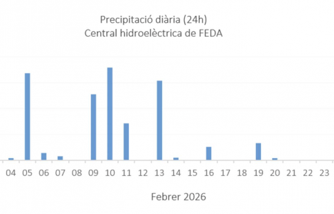 El mes de febrer també ha estat molt plujós, amb una precipitació de més del triple de la mitjana climàtica. La precipitació acumulada ha estat de 98mm a la Central de Feda, i segons apunta Acció Climàtica, és “el tercer febrer més plujós des de 1950, només al darrere del de 1971 (148,3mm) i el de 1978 (107,7 mm)”. La precipitació mensual acumulada més abundant (127,2 mm) s’ha registrat al bony de les Neres, mentre que l’acumulació més baixa s’ha registrat a la Borda Vidal (96mm).