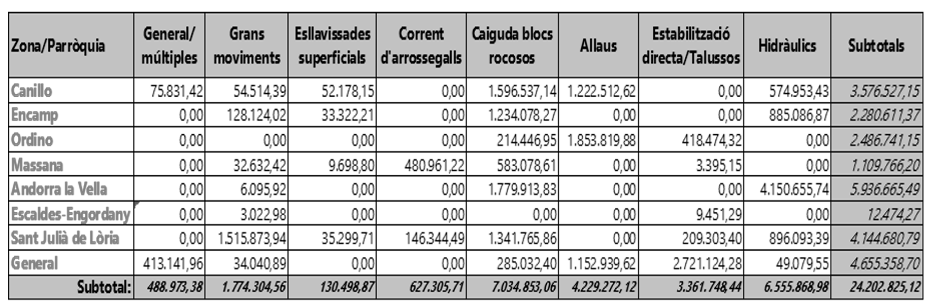 Finalment, s’assenyala que en el cas, per exemple, d’Escaldes-Engordany, és la parròquia amb menys inversió associada a riscos els darrers deu anys, bàsicament perquè les grans actuacions i especialment les de tipologia hidràulica, es van fer en dècades anteriors. A més, presenta pocs riscos tant de caiguda de rocs com de talussos.