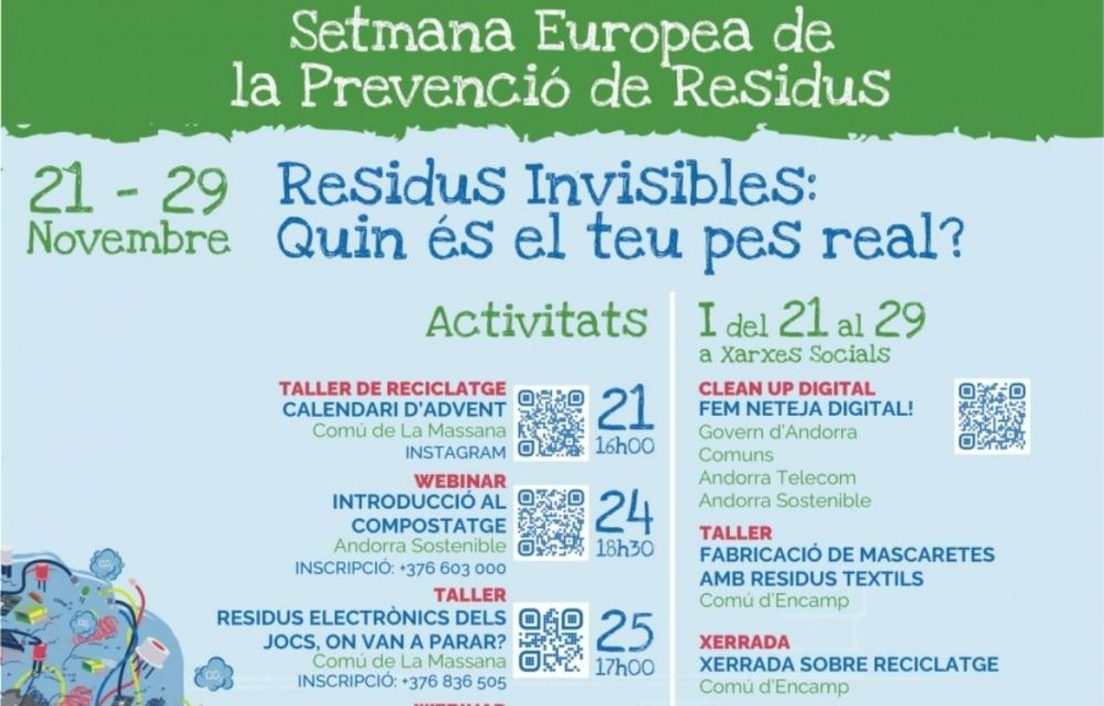El dimecres 25, al Punt 400 del comú de la Massana, i de forma presencial amb difusió on línia, hi haurà un taller-xerrada sobre ‘Residus electrònics dels joves, on van a parar?’ a les 17.00 hores. I el divendres 27, se celebrarà el taller de tèxtil i de vidre del comú d’Escaldes-Engordany, un taller presencial de ‘Fundes personalitzades per mascaretes’.
