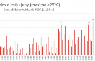 També, però, s’ha registrat una alça important dels dies d’estiu (el Servei Meteorològic Nacional considera ‘dies d’estiu’ les jornades amb màximes superiors als 25 graus) a la central que té FEDA a Ransol. En aquest cas, s’han sumat 19 dies; l’anterior rècord data del 2002 (amb onze dies). El 2022, un any especialment calorós, foren vuit els dies (la mateixa xifra que el 2003). Amb aquestes dades –i a l’espera de divulgar el butlletí climàtic corresponent–, el Servei Meteorològic d’Andorra ja confirma que la temperatura mitjana del mes de juny ha superat, també, l’últim rècord registrat.