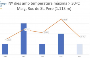 Tal com informa el Servei Meteorològic Nacional, ahir es va arribar als 30,7 graus al Roc de Sant Pere (a 1.113 metres d’altitud); el 1994, el 2001, el 2012 i el 2022 també es va superar aquest valor durant aquest mes
