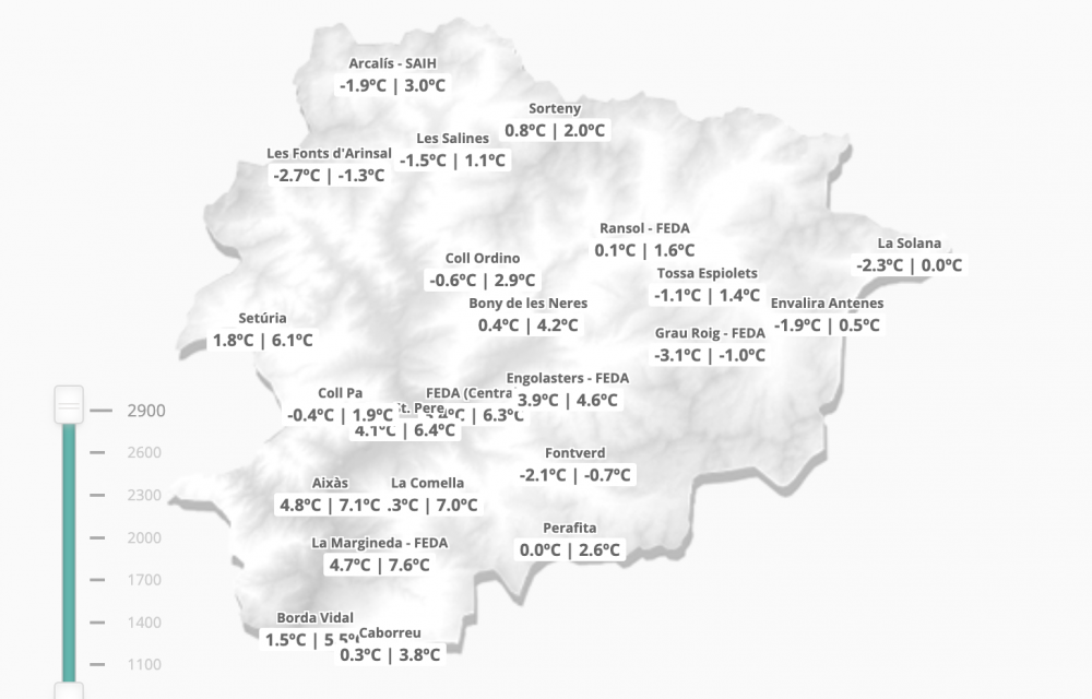 La nit ha estat freda arreu del país i pràcticament en cap punt les temperatures mínimes han arribat als 5 graus. De fet, des del Servei Meteorològic s’ha destacat que l’estació situada a menys altitud (864 metres) i en el punt més meridional d’Andorra, la de la Borda Vidal, ha registrat la mínima més baixa des que es tenen registres (2008). Aquest dissabte s’ha arribat a 1,5ºC i l’anterior més baixa havia estat el 30 de setembre del 2022, amb 2,5ºC.