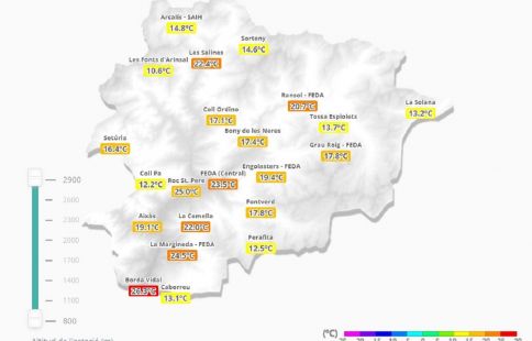 Les previsions indiquen que de cara a l’inici de la setmana vinent les altes pressions que hi ha sobre el Mediterrani i el nord d’Àfrica comportarà un augment de les temperatures amb màximes per sobre del què és habitual per aquesta època de l’any. El dia més calorós serà dimarts amb màximes que poden arribar als 37 graus a Andorra la Vella, 33 a 1.500 metres i 22 al Pas de la Casa. Tot i això, es preveu que les temperatures mínimes es quedin als 18 graus a la capital i als 13 a 1.500 metres.