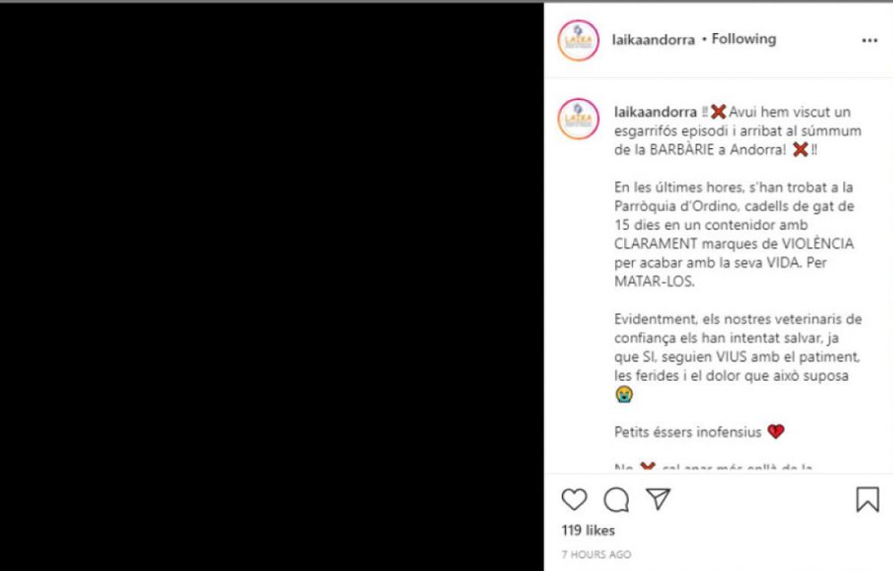 A través d’un post a Instagram, l’entitat ha carregat durament contra l’autor dels fets. “No cal anar més enllà de les fronteres per veure massacres d’aquest tipus”, han lamentat, a la vegada que asseguren que “farem justícia” pels gats morts. Acompanyava la publicació una imatge tota en negre com a senyal de dol.