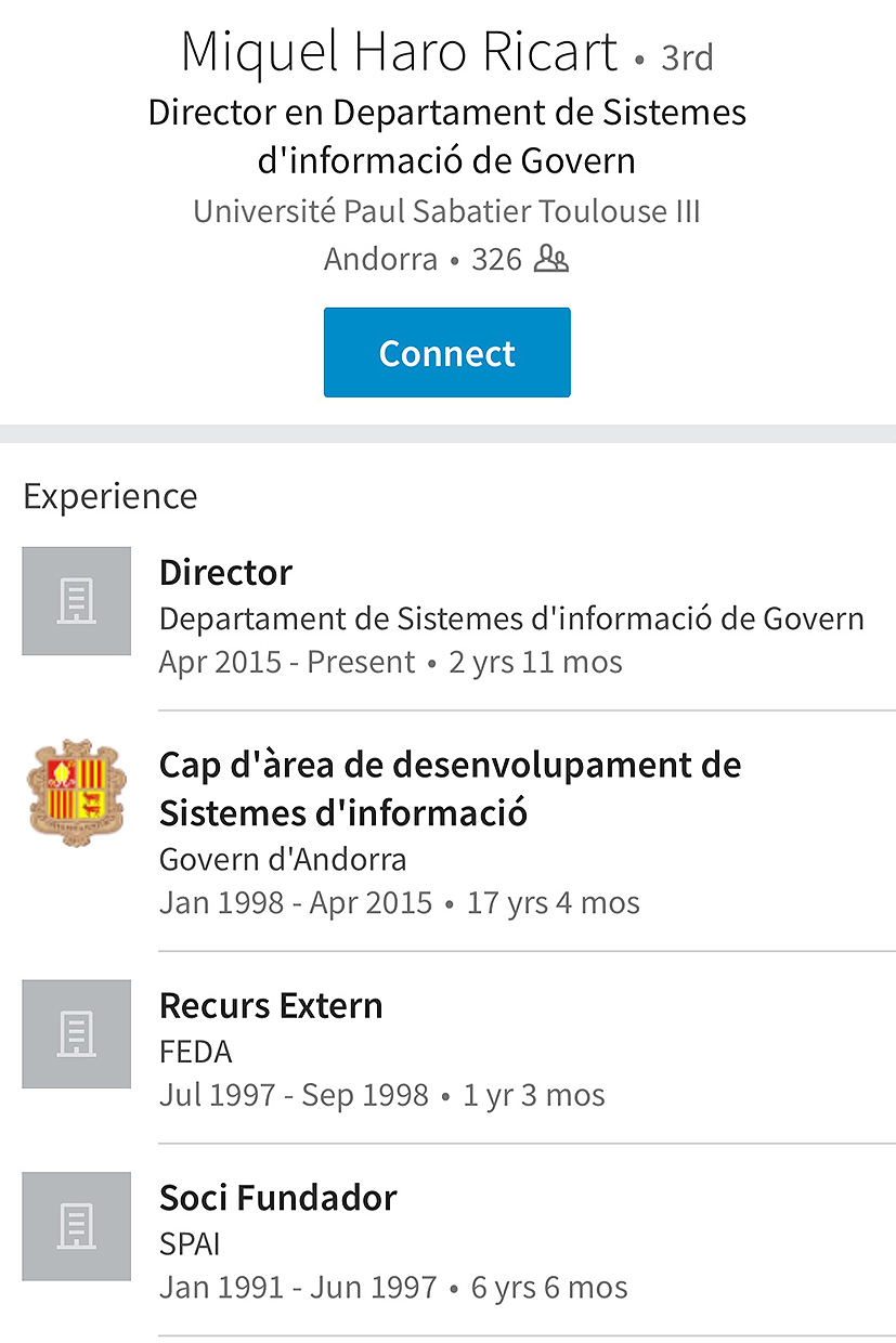 No cal una gran investigació per mantenir aquestes vinculacions. El propi Miquel Haro inclou el seu currículum acadèmic i laboral en el seu perfil personal de LinkedIn, la xarxa social orientada als professionals i als negocis. Haro va arribar a la direcció del departament de Societat d’Informació -amb anterioritat era cap d’àrea- just en iniciar-se la segona legislatura de Demòcrates per Andorra (DA). És a dir, el segon mandat de Toni Martí. I és a partir de llavors que el cap de Govern comença a signar adjudicacions de tasques de manteniment de programari o maquinari o xarxes o totes dues o tres en funció de l’encàrrec a favor d’SPAI.