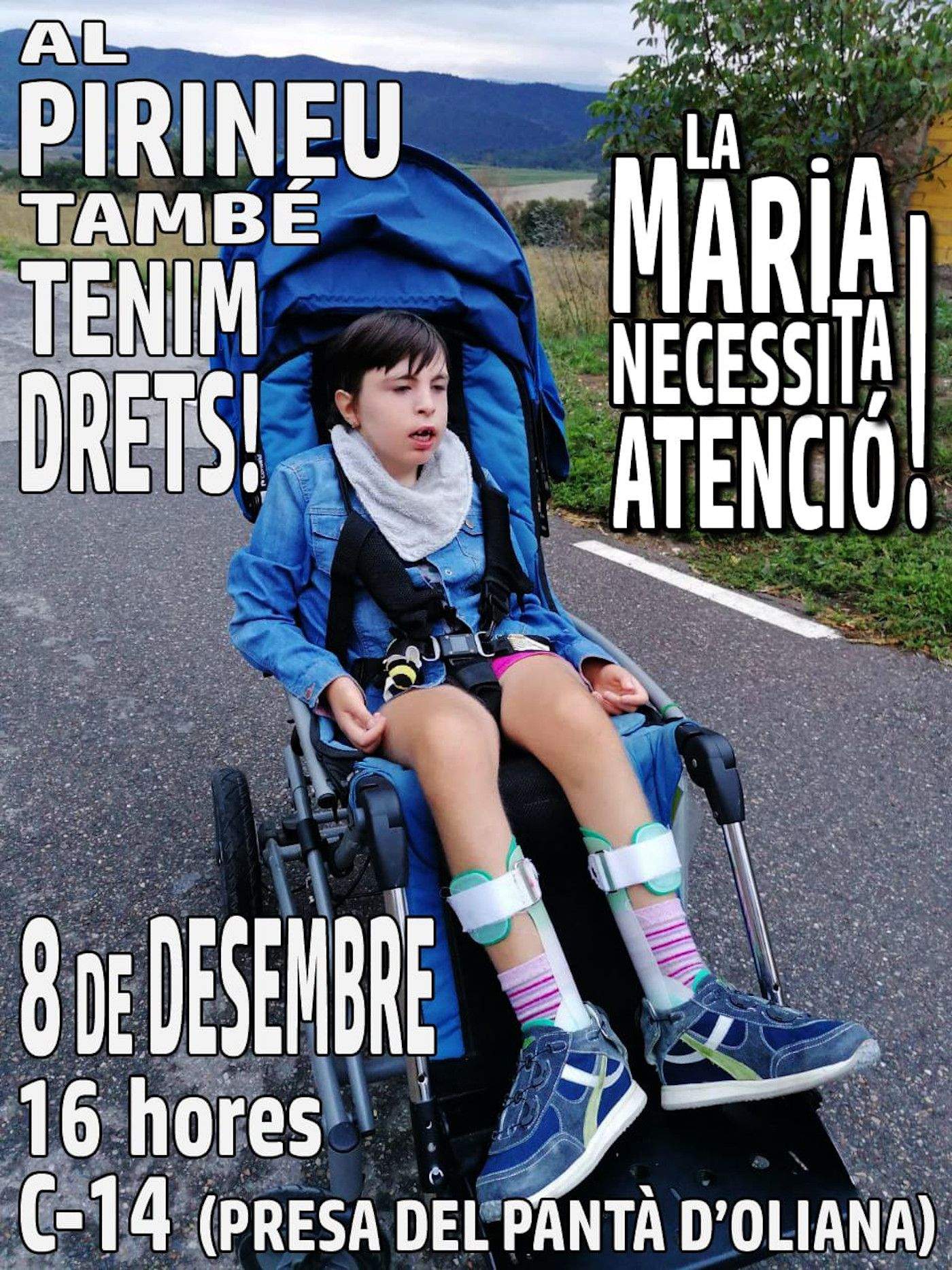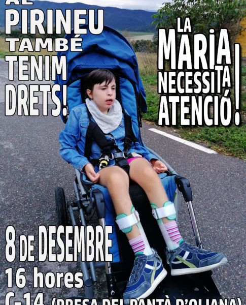 Davant aquesta situació, la família ha decidit optar per accions més contundents. I s’entén que el 8 de desembre és un dia oportú per iniciar mobilitzacions. “Les solucions s’esgoten al mateix ritme que les possibilitats de desenvolupament de la filla”, denuncien. Per això, s’ha convocat l’acció de protesta, sota el lema “La Maria necessita atenció! Al Pirineu també tenim drets”, que, tot s’ha de dir, pot suposar un greu problema per a l’operació tornada.