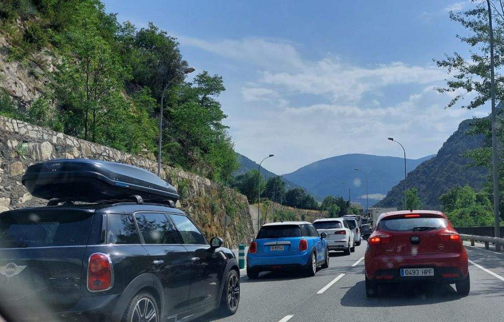 Cap de setmana de juny, bon temps i altes temperatures... La combinació comporta un resultat lògic: són moltes les persones residents que volen passar els dos dies festius lluny del país, principalment a destins de platja. I això comporta que el tram de sortida del Principat estigui registrant una notable afluència de vehicles.