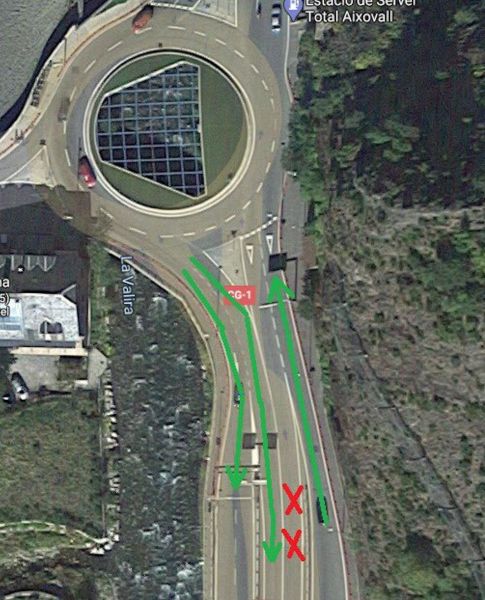 Per altra banda, els vehicles que pugin des de Sant Julià cap a la rotonda d’Aixovall hauran d’emprar el viaducte. El pas inferior existent fins ara ha quedat eliminat. Només es podrà fer servir per part dels veïns i per aquells conductors que vulguin accedir a la benzinera de la zona.