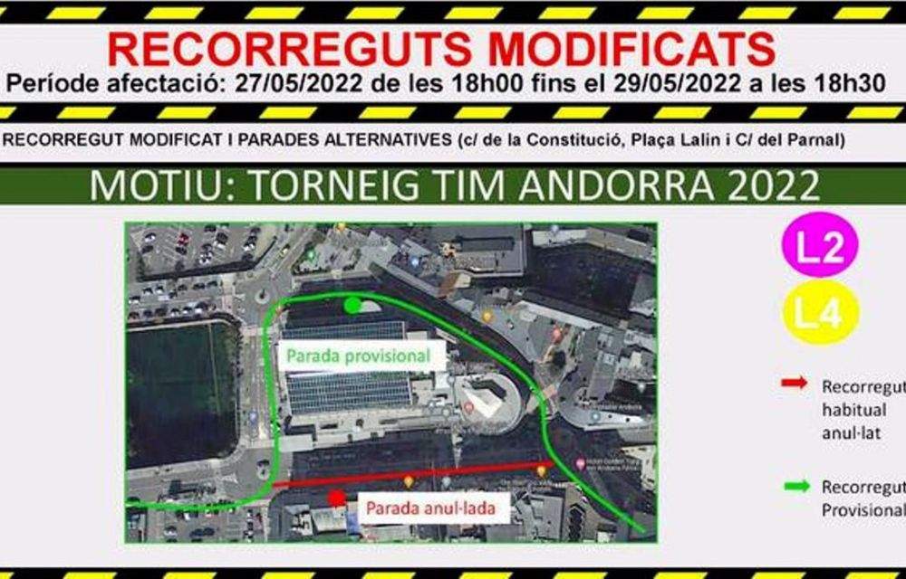Així, la parada plaça Coprínceps (705), quedarà anul·lada durant aquest període. Al seu lloc, s’habilita una parada provisional al carrer del Parnal de la parròquia escaldenca. El motiu dels canvis és la disputa del TIM Andorra 2022, una competició de bàsquet per a equips de base que inclou la participació de molts equips.