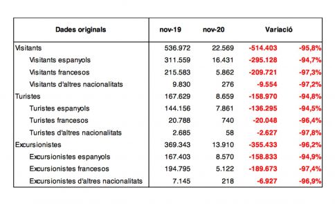 Segons les dades d’Estadística, el mes de novembre del 2020 han entrat al país 22.569 persones, amb una variació negativa del -95,8% del nombre de visitants respecte al mes de novembre de l’any passat. El nombre d’excursionistes ha estat de 13.910 amb una variació negativa del -96,2%, respecte al mes de novembre de l’any passat. Quant al nombre de turistes ha estat de 8.659 amb una variació negativa del -94,8% respecte al mes de novembre de l’any passat.