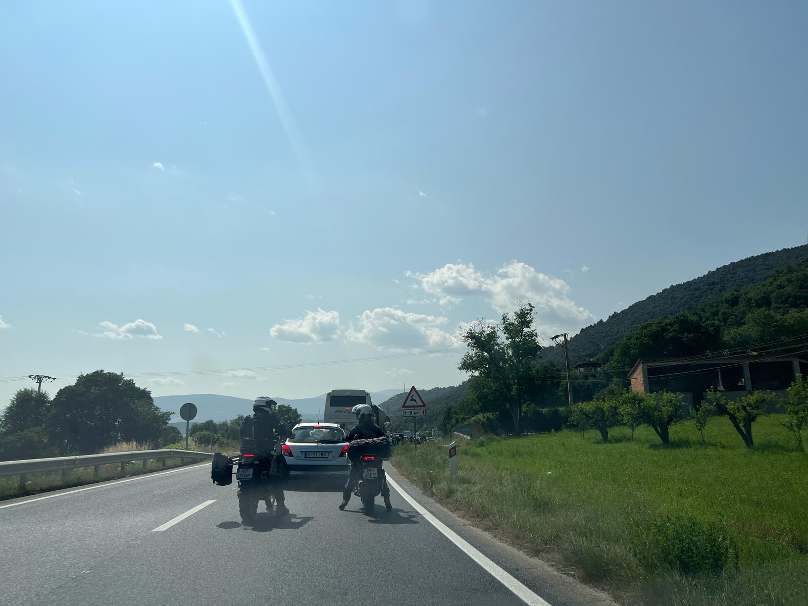 Els cotxes, aturats abans d'arribar al punt duaner el dilluns de Pentecosta.