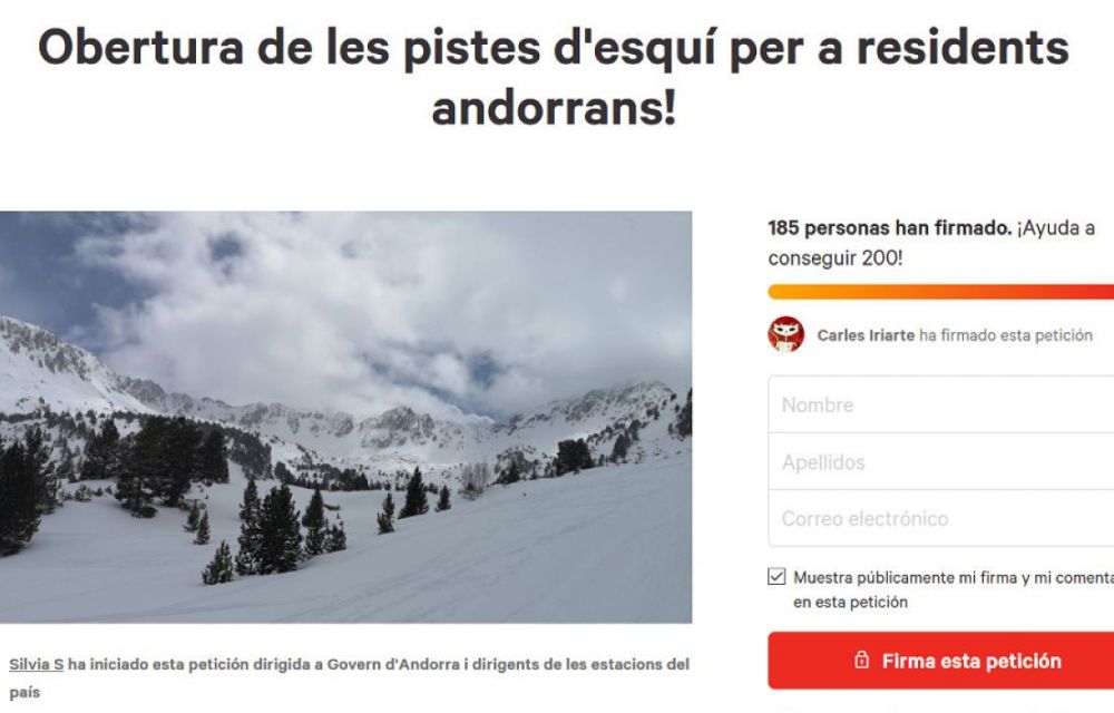 En concret, es reclama que “obrin les pistes per a residents”. Es remarca que “Andorra gaudeix de les millors estacions del sud d'Europa i se'ns està prohibint la pràctica de l'esquí perquè els països veïns no volen que els seus ciutadans vinguin a esquiar”. Asseguren que “és una llàstima, i molts estem ben decebuts”.